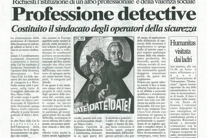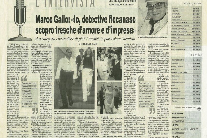 L’ASI global consultants, nasce come Istituto di Investigazioni Private ai sensi dell’Art.134 del T.U.L.P.S.; ha sede a Salerno ed è operante in Italia e all’estero, con professionalità ed esperienza dal 1995. Da sempre, le indagini investigative sono tese a ricercare ed individuare elementi di prova che abbiano pieno valore ai fini legali. Oggi, le nuove sfide suggeriscono ormai un coinvolgimento completo e puntuale dell’Investigatore Privato nella ricerca di ogni possibile indizio o prova che possa essere legalmente valida ed anche utile all’avvocato civilista o penalista. L’esperienza maturata per oltre 25 anni dell’ASI nelle investigazioni private, nella persona del suo titolare Marco Gallo e dei suoi esperti collaboratori, risponde alle moderne domande del mercato. Grazie ai moderni strumenti elettronici, di cui si avvale per le sue Consulenze, l’ASI garantisce competenze per ogni tipo d’indagine, sia in sede civile che penale, secondo quelle che sono le necessità del Cliente. L’attenzione al Cliente è prioritaria, che sia esso un Privato o un Professionista, le nostre Consulenze sono valide in sede Legale.